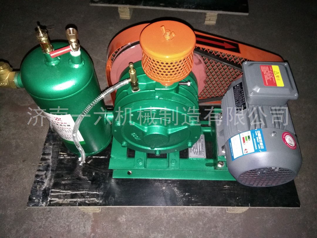 一六回转式鼓风机结构精巧,主要由下列六部分组成:电机、空气过滤器、鼓风机本体、空气室、底座(兼油箱)、滴油嘴。鼓风机靠汽缸内偏置的转子偏心运转,并使转子槽中的叶片之间的容积变化将空气吸入、压缩、吐出。在运转中利用鼓风机的压力差自动将润滑送到滴油嘴,滴入汽缸内以减少摩擦及噪声,同时可保持汽缸内气体不回流。